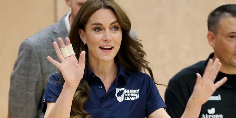 Today, Kate once again sported bandaged up fingers when meeting Disability Rugby League players in Hull – just three weeks after she injured her hand while trampolining with her children.