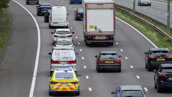 A vehicle is seen with a ‘No to 20mph’ sign across its back window and accompanied by police as drivers stage a go slow convoy protest driving at 30mph on the M4 from Magor Services near Newport to Swansea