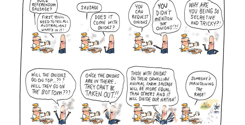 Dyson’s cartoon (Saturday Age, 7/10) illustrates the awful division I see around the referendum. For example, a friend of mine in outer Melbourne had his Yes corflute overwritten with the word “No”. After repairing it, his sign was stolen. He put up three new signs, and they all went. He tried again, with the same outcome.